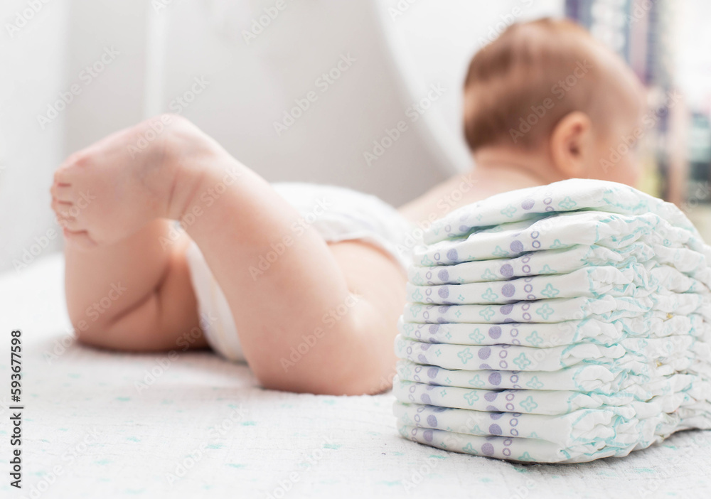Fotografia The legs of a baby in a diaper against the background of a stack of children's c