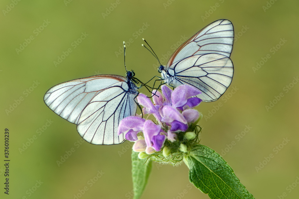 Quadro em tela Two butterflies Aporia crataegi on a field flower in the early morning waiting f